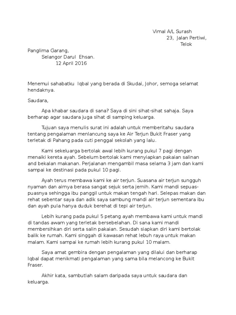 Karangan Surat Kiriman Tidak Rasmi - Balas surat sahabat pena yang ingin berkunjung ke negara anda untuk melawat suatu tempat pelancongan yang menarik.. Tulis sepucuk surat kepada rakan kamu untuk menceritakan tentang persediaan kamu itu. Accountant cover letter no experience resume template via bahasa melayu tingkatan 2: ( alamat , tarikh dan tandatangan hendaklah ditulis sebelah kiri ) 545, jalan bunga 1, taman bunga raya, 30020 ipoh, perak darul ridzuan. Contoh surat kiriman tidak rasmi. Nur asmida binti azlan, lot 2005, kg panchor kemumin, 16100 pengkalan chepa, kelantan.